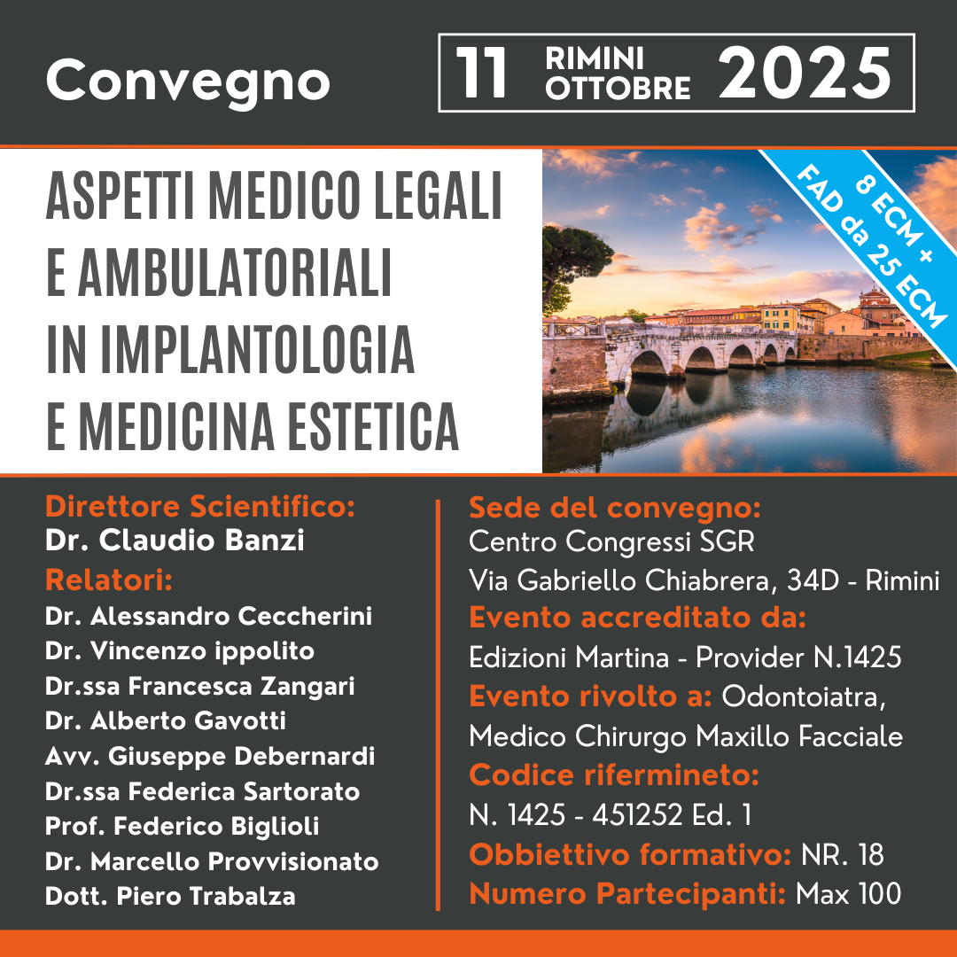 “Aspetti medico legali e ambulatoriali in implantologia e medicina estetica” che si terrà il 11 ottobre 2025 presso il Centro Congressi SGR (via Chiabrera, 34 Rimini).